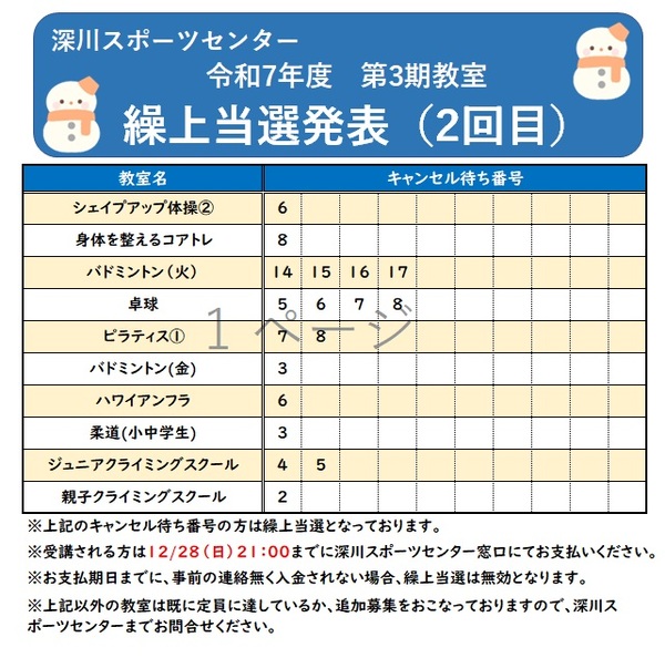 繰上げ当選の発表は、深川スポーツセンターホームページ内・X(旧Twitter)・館内掲示にてお知らせいたします。※第1回、第2回の繰上は、お電話での連絡はいたしませんので、ご注意ください。