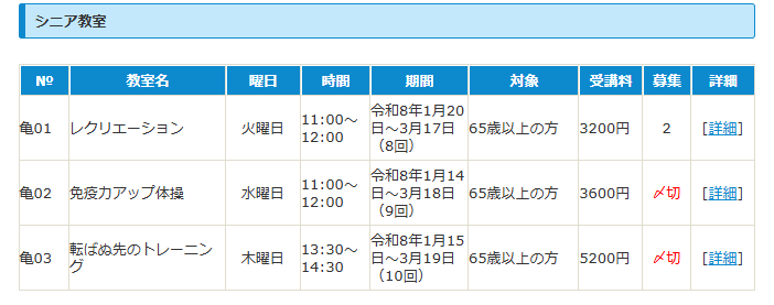 | 亀03 | 転ばぬ先のトレーニング | 木曜日 | 13:30~14:30 | 令和8年4月9日~7月30日(17回) | 65歳以上の方 | 8840円 | 40 | [詳細] |
