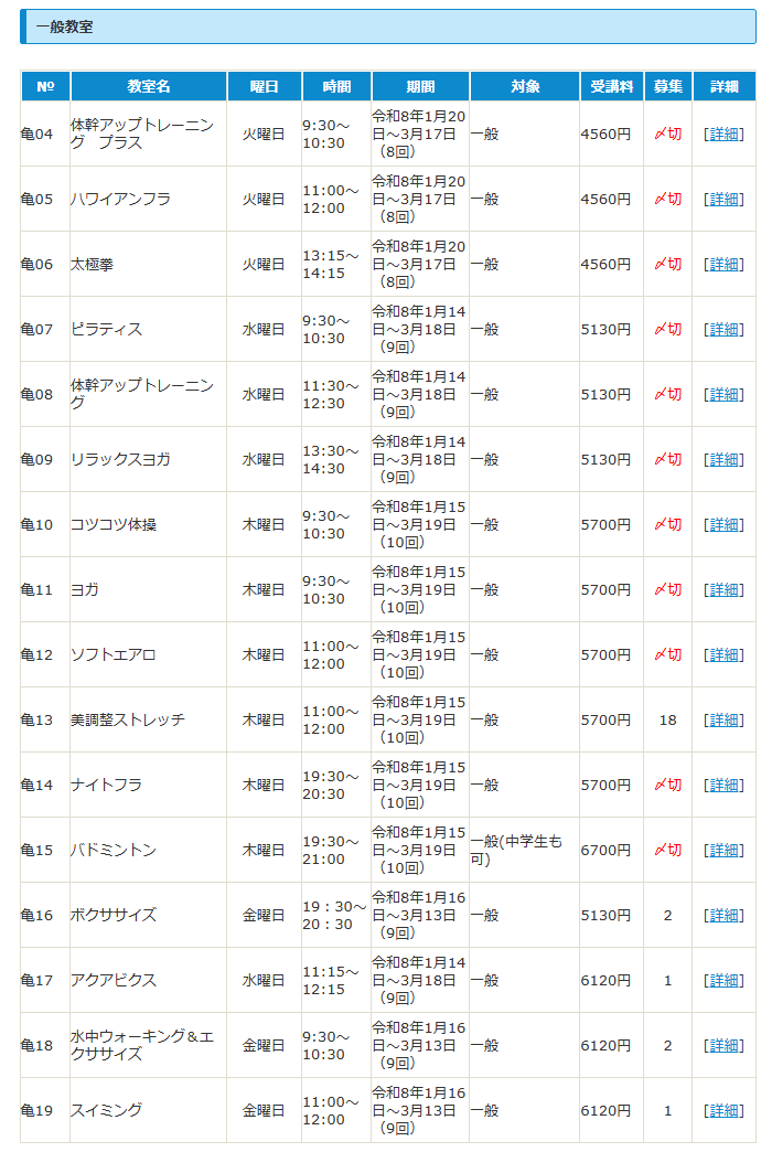 | 亀08 | 体幹アップトレーニング | 水曜日 | 11:30~12:30 | 令和8年4月8日~7月29日(15回) | 一般 | 8550円 | 40 | [詳細] |